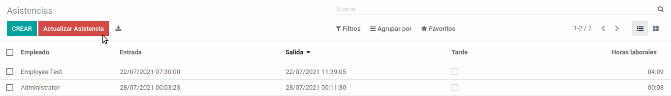 Nota: En este caso, quiero poner el botón justo después del botón CREAR que se muestra sobre la vista Tree, del modelo 'hr.attendance' específicamente (no lo queremos sobre todos los Trees de nuestro sistema)
