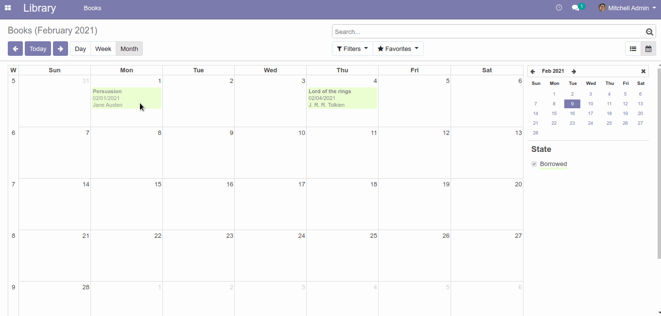 La vista calendario muestra los registros como eventos en un calendario diario, semanal, mensual (y a partir de Odoo 14 también se incluye el calendario anual).
